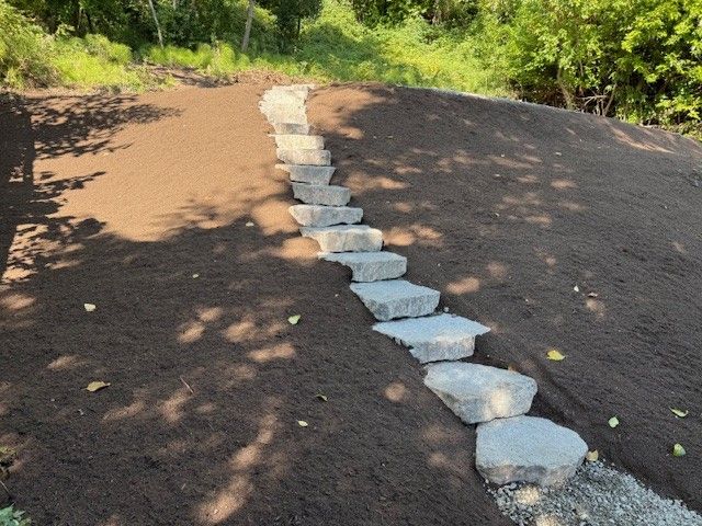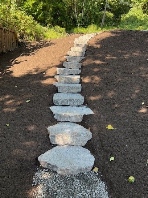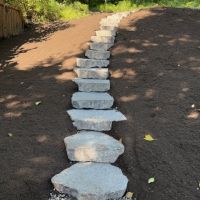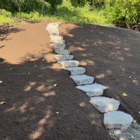 20 Belgard landing steps in grey color set into existing soils to make a wonderful garden stairway. Landscaping to come...